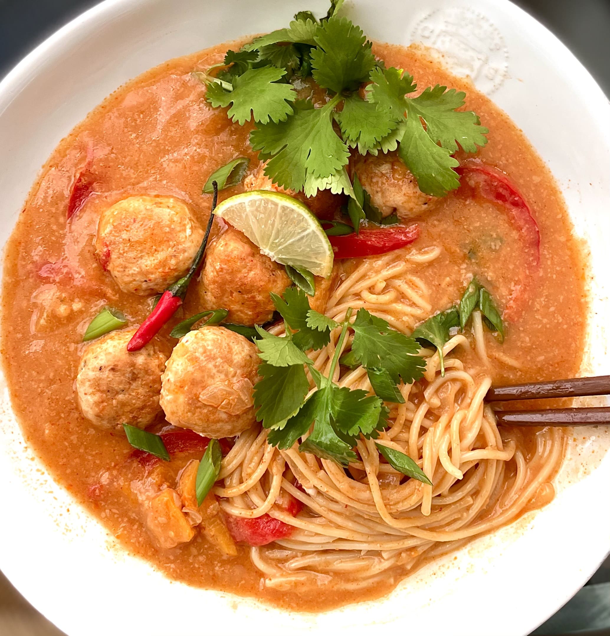 - Add the coconut milk, peanut butter, lime juice and fish paste. Bring to a boil, then simmer, stirring constantly, until the peanut butter and fish paste has dissolved, about 5 minutes. Increase the heat to medium, then add back the chicken meatballs along with the bell pepper, squash, chili pepper (optional). Cover the pan with a lid and cook, until the squash is fork tender, about 5 minutes. Remove from heat. Remove and discard the lemon grass.