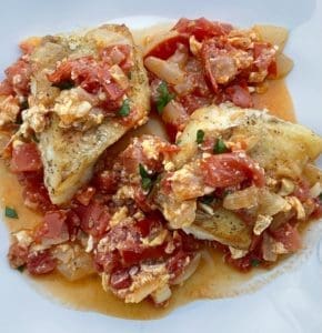 This is an everyday Filipino dish that I like to make in the Summer when tomatoes are so good and sweet. I used cod on this recipe. Tilapia or salmon is also good.