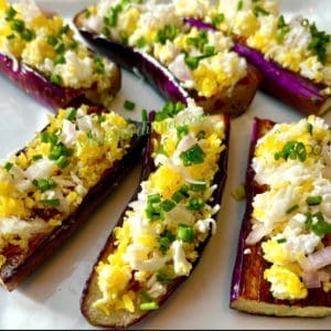 • For each eggplant spread these layers on top: first - spread the "bagoong" or fish paste very thinly, second - spoon some grated eggs, third- sprinkle some scallions, fourth - sprinkle some chives. Enjoy!